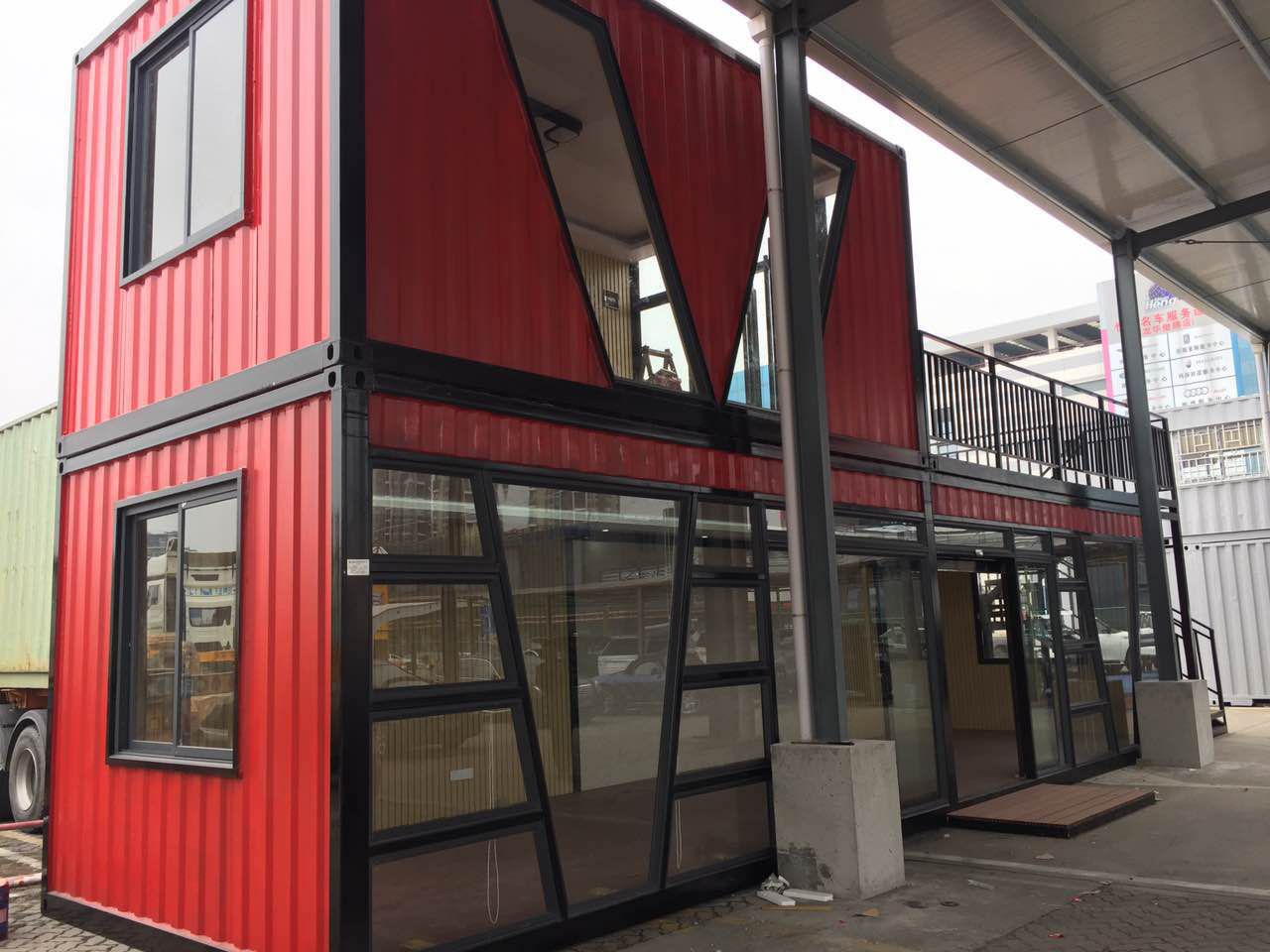 Container and steel structure combination building, one two half aerial set aside three truck parking Spaces. The second and third floors are connected by corridors, and the indoor area of the third floor is 392 square meters, with abundant office and living space.